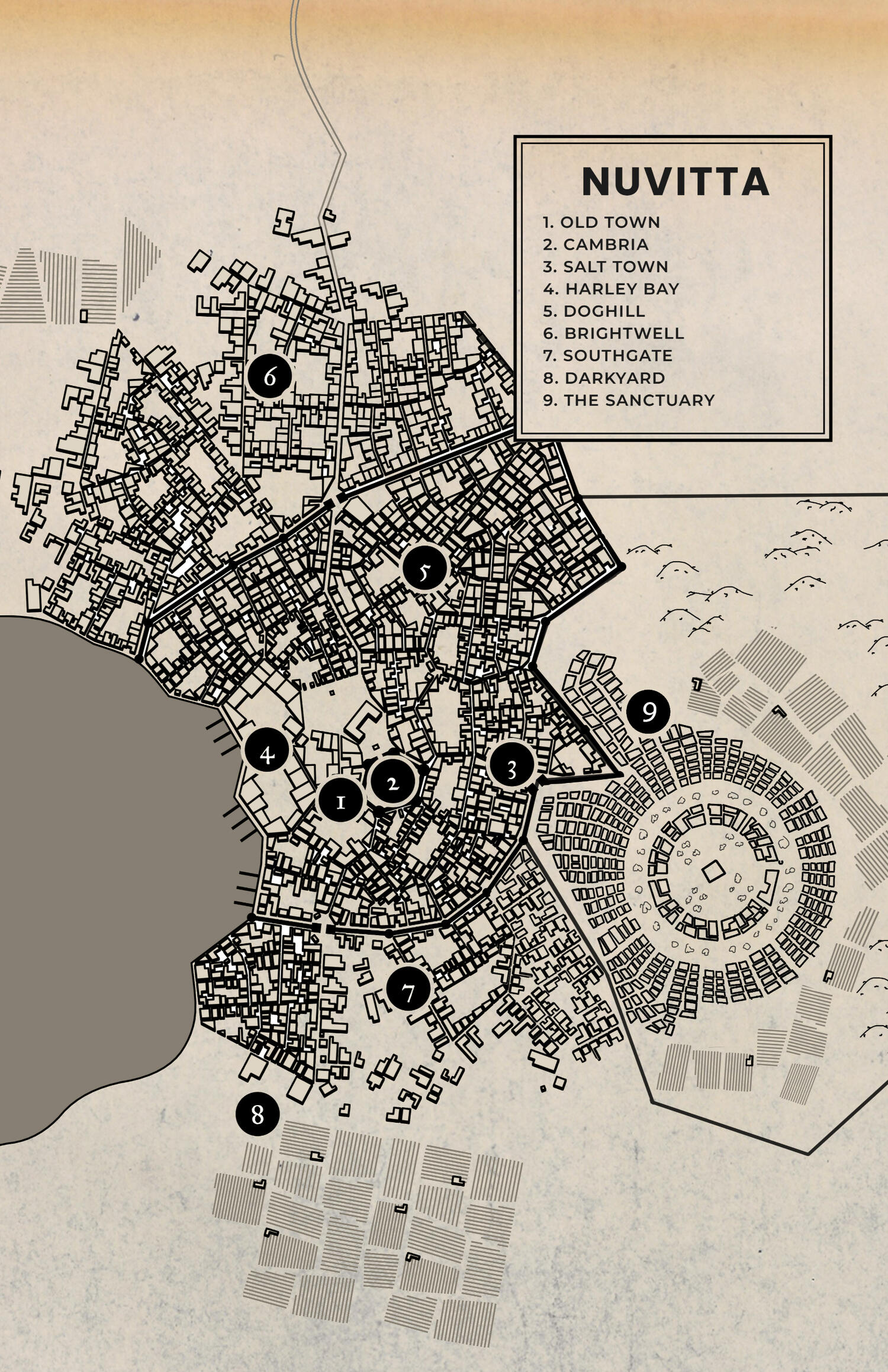 OLD TOWN - Historical District - Located at the center of the city, this is where the original buildings were built and later converted into the political square. Many city functions, celebrations, and announcements took place here.CAMBRIA - Business District - State-of-the-art high-rises and office buildings tower over the city from Cambria. This is where many innovators, financiers, artists, and technology scientists worked.SALT TOWN - Residential & Educational District - This residential and educational district had middle-class housing. The schools in this district serviced everyone in the city. Hosting preschool to college, most civilians were comfortable in this part of town.HARLEY BAY - Transportation District - The location of Nuvitta's port patrol, this district used to service sailors and their families. Those who lived in this district were usually "lower-middle class" and tied to jobs of service (police, firefighter, military, etc.)DOGHILL - Entertainment District in Nuvitta - Doghill was best known for its great nightlife, entertainment venues, and some of the best restaurants in the world. Those who lived in this area were mostly single, upper-middle-class citizens.BRIGHTWELL - Upper-Class District - This district was where the majority of the wealthiest Nuvitta residents lived. McMansions, family-focused neighborhoods, and well-maintained parks. This is where you wanted to raise children and where you looked forward to growing old.SOUTHGATE - Low-Income District - This district was a residential district where low-income and affordable housing was built. It included several parks and agricultural towers. Many who lived and worked here were food- and customer-service technicians or lived exclusively on UBI with no additional credits.DARKYARD - Network District - This district is where those who worked for the Nuvitta Network lived and worked. This included technicians, developers, and tech nerds. It is where our heroes set up their bunker for the last few years.THE HIVE - Sanctuary District - Six months after the pandemic annihilated the Nuvitta public, a large WALL was 3D-printed around a small section of Salt Town. Survivors were unaware of who was behind the structure but made note of the Bee-like drones that patrolled it. Anyone who got too close to the wall was never seen again. It is known by many as, The Hive.